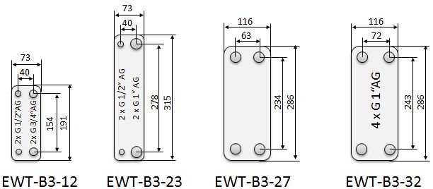 Plattenwärmetauscher Größenübersicht Plattenwärmetauscher EWT-BC4-500, Unex PB97, Danfoss XB70